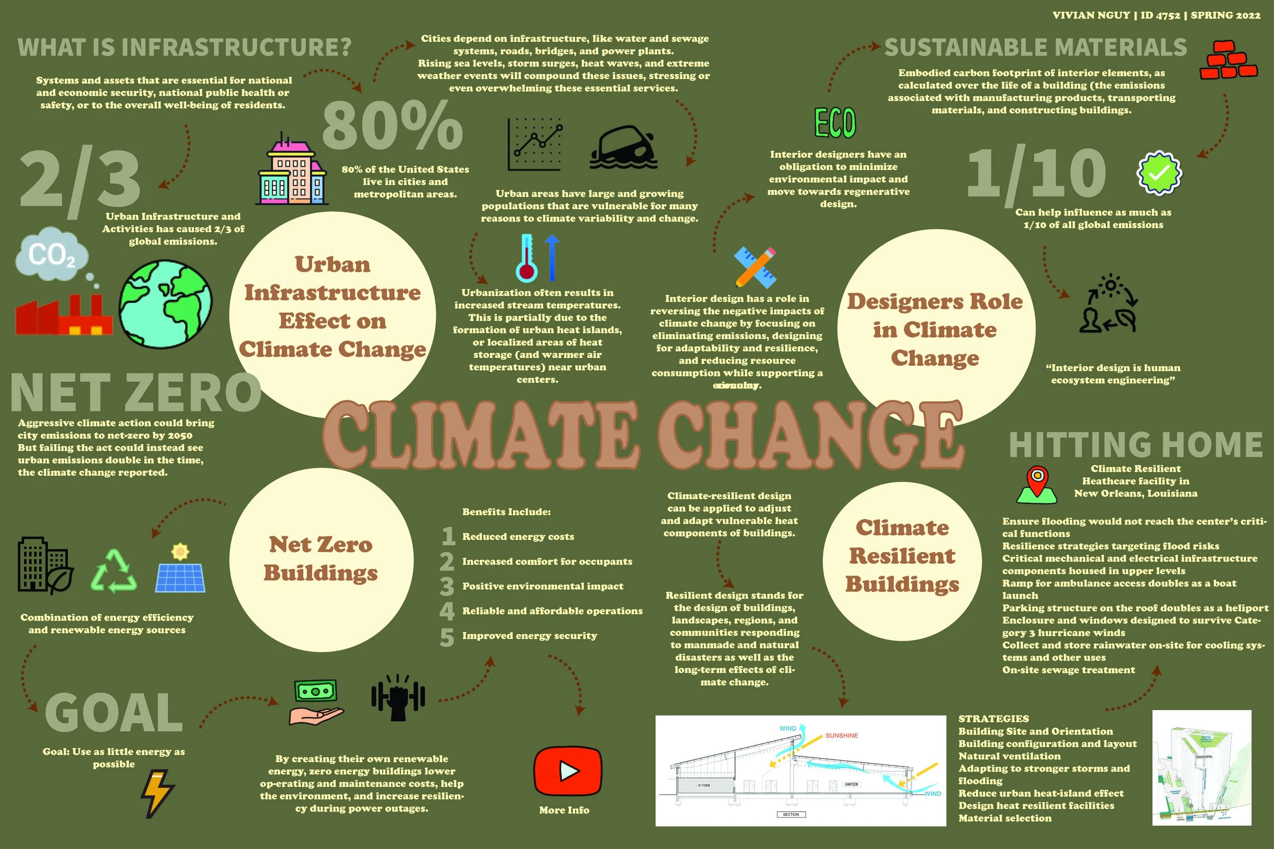 As interior designers, we are responsible for mitigating climate change effects. Through building material selections, finishes, and system selections, embodied carbon and energy consumption can be reduced. Designing for climate adaptation is critical to navigating sustainability for the natural environment and the safety of its users.
