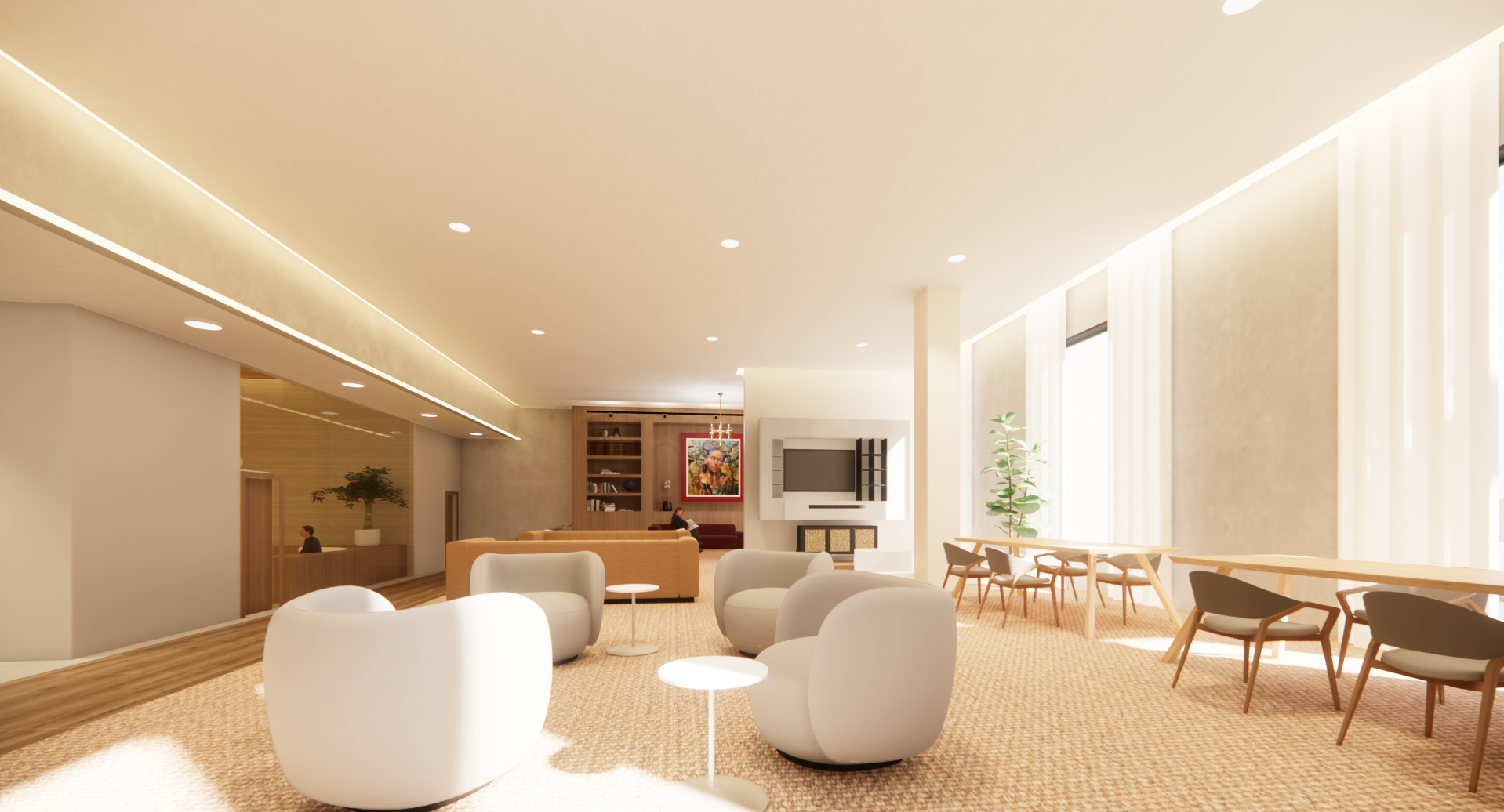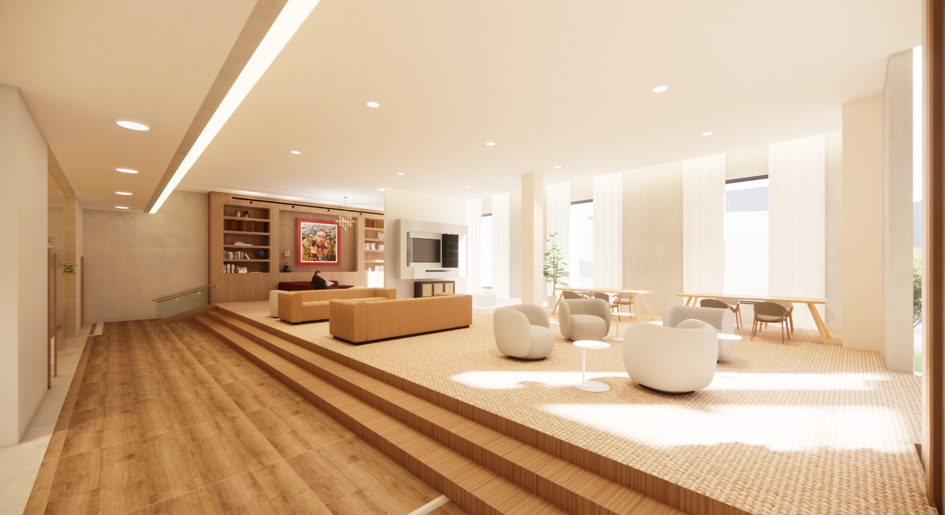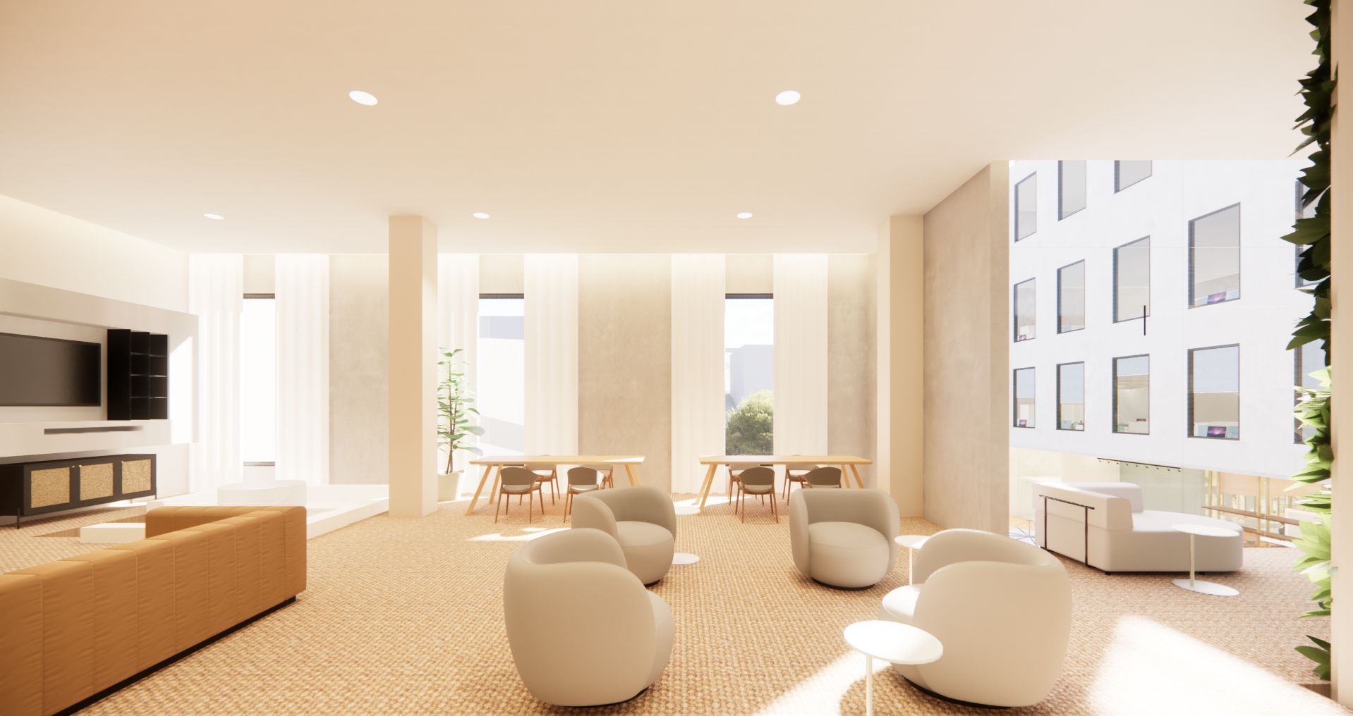 The programmatic blend of spaces offers a serene refuge where employees can thrive both personally and professionally, surrounded by nature, community, and opportunities for self-care.