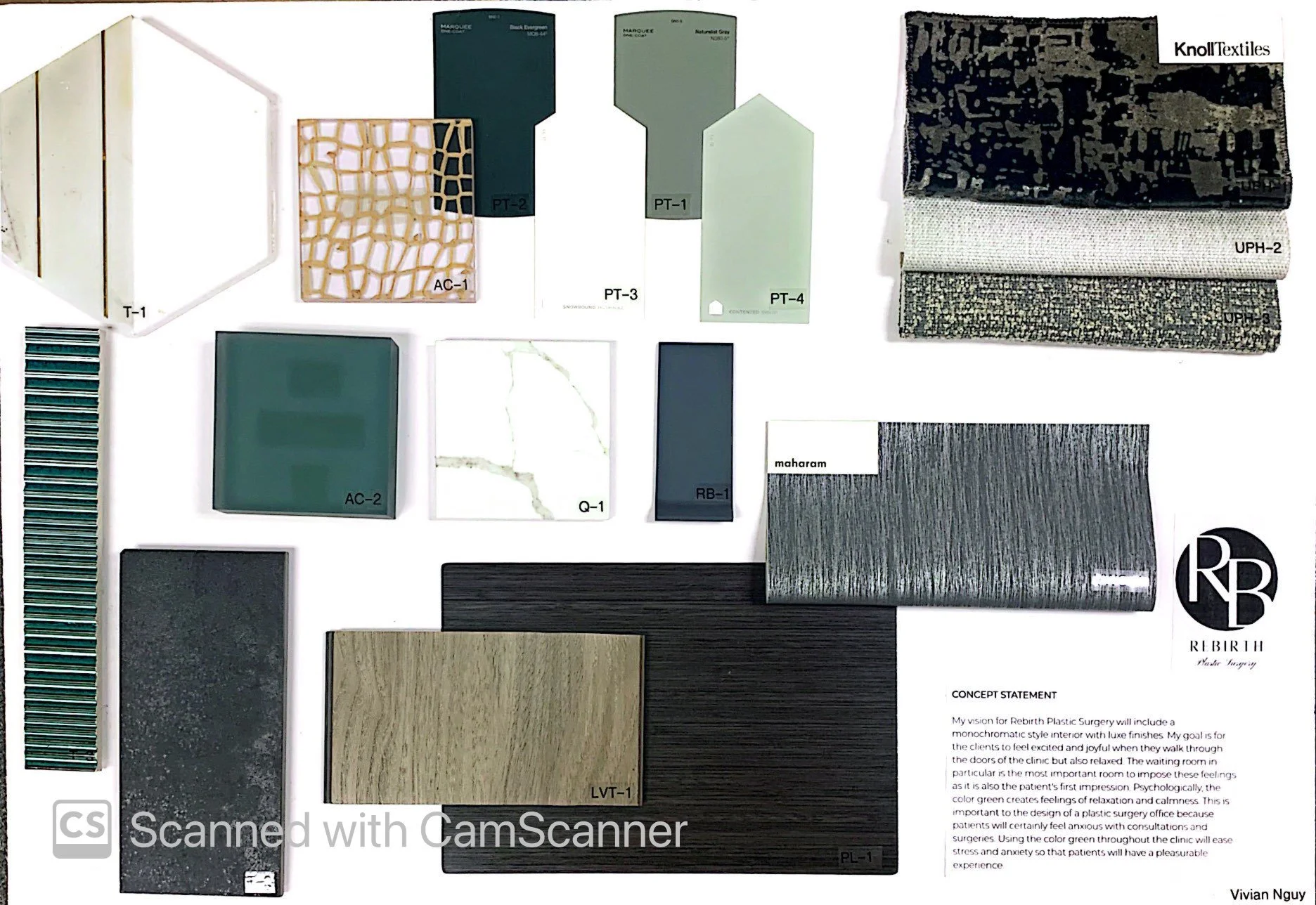 My vision for Rebirth Plastic Surgery includes a monochromatic style interior with luxe finishes. My goal is for clients to feel excited and joyful when the walk through the doors of the clinic, but also relaxed. The waiting room in particular is the most important room to impose these feelings as it is also the patient’s first impression. Psychologically, the color green creates feelings of relaxation and calmness. This is important to the design of a plastic surgery clinic because patients will certainly feel anxious with consultations and surgeries. Using the color green throughout the clinic will ease stress and anxiety so that patients will have a pleasurable experience.